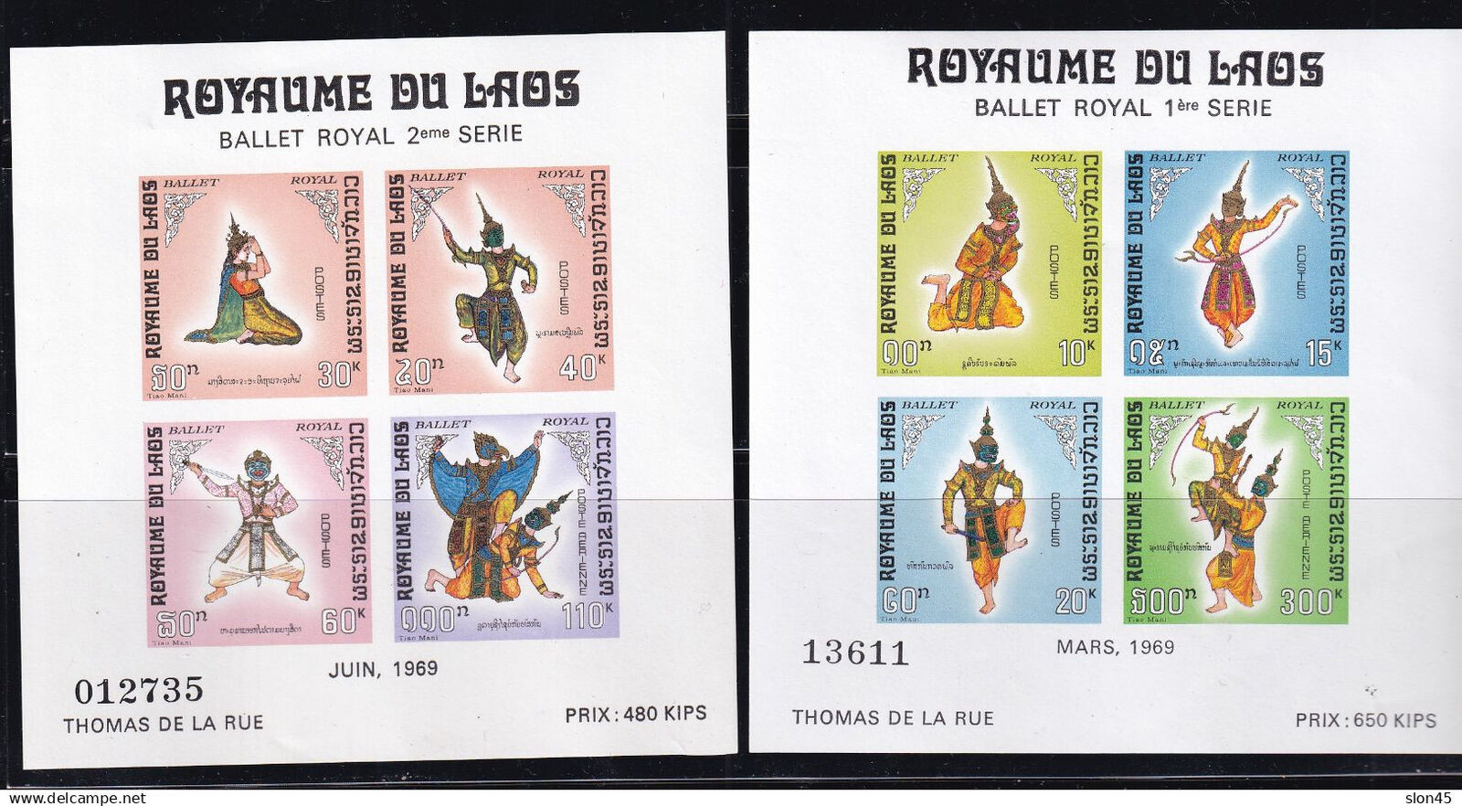 Grade: UngradedLaos 1969 2 Imperf Souvenir Sheets Ballet Royal 1 2 serie MNH 16576 Sc C56a C57a One sheet is slightly folded
