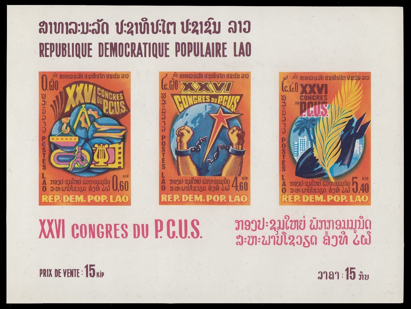 Laos, Scott #335a, 1981 26th Communist Party (PCUS)) Congress Souvenir Sheet issue in Mint Never Hinged condition.Scott 2026 Catalogue Value $7.00