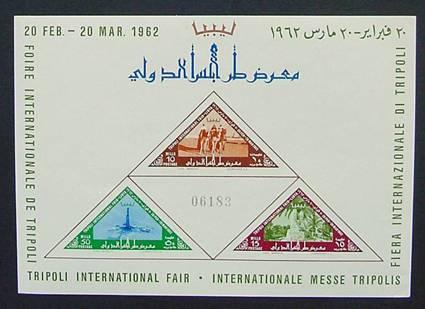 Souvenir sheet issued in 1962, for the International Fair in Tripoli. Never hinged.