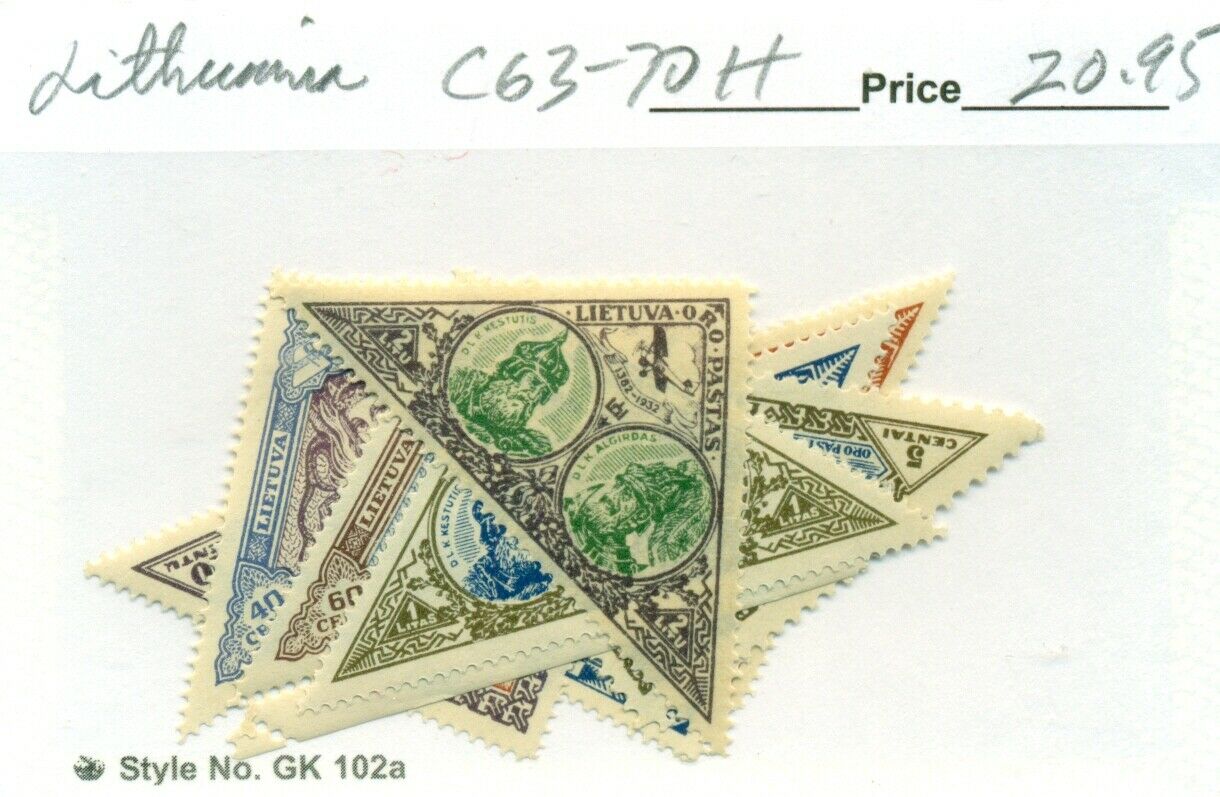 LITHUANIA #C63-70, Mint Hinged, Scott $20.95 Email us with any questions. Visit our Hip STORE. CONDITION: All stamps are genuine and without faults and all mint stamps are with original gum unless otherwise desc ... Read More