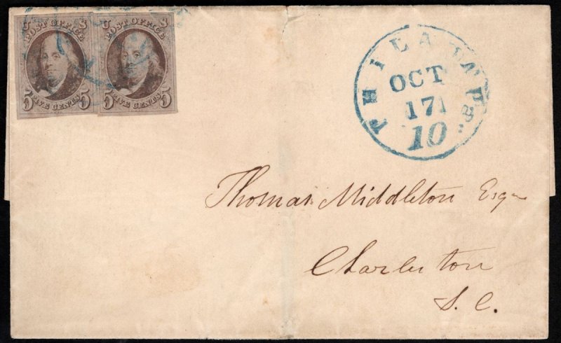 1 XF pair of singles on cover, stamps are XF-SUPERB, nice four mark copies, blue "Philada, Pa" cancels, SELECT COVER!Steve Malack Stamps