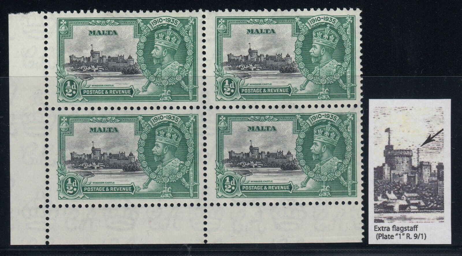 Malta, SG 210a, MNH block "Extra Flagstaff" variety
