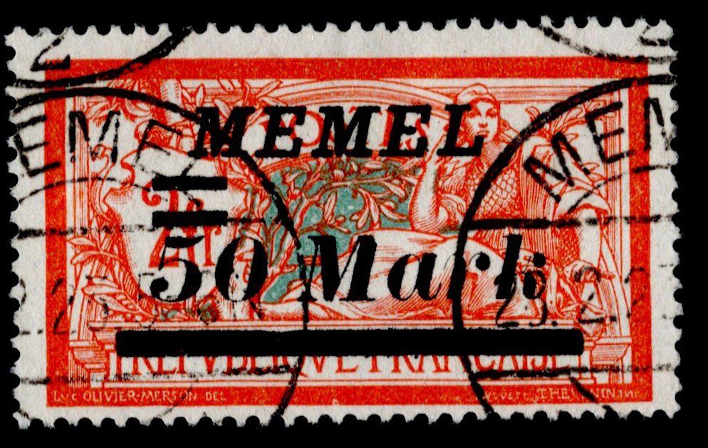 France 2fr Liberty and Peace Surcharged Memel 50 Mark. Used.