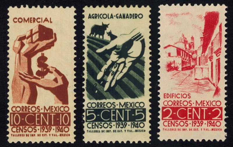 2c View of Taxco. 5c Allegory of Agriculture, 10c Two Hands Holding Symbols of Commerce Census Taking. Mint never hinged.
