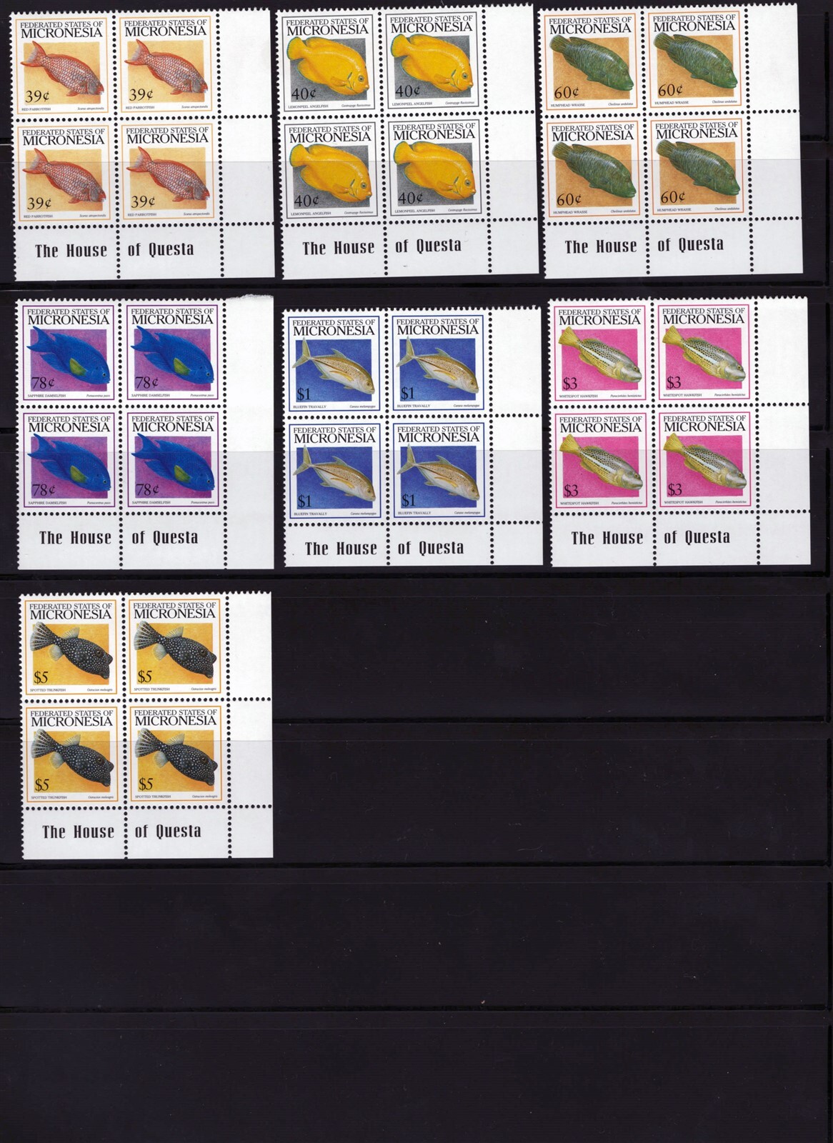 Fish Definitive Issue of 1998-1999 Printer Blocks/Plate Blocks of Micronesia This group of MNH VF blocks includes the Scott# 301-319A and 328-332. The $11.75 value of the 1999 set (Scott #333) is not included. All most of the blocks printer blocks showing the House of Questa name. Six blocks are plate blocks. Face value is $115.24.Seller Information