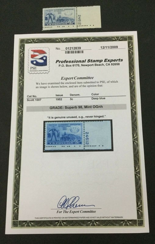 US #1007 MINT OG NH **PSE GRADED CERT SUP-98** #31249