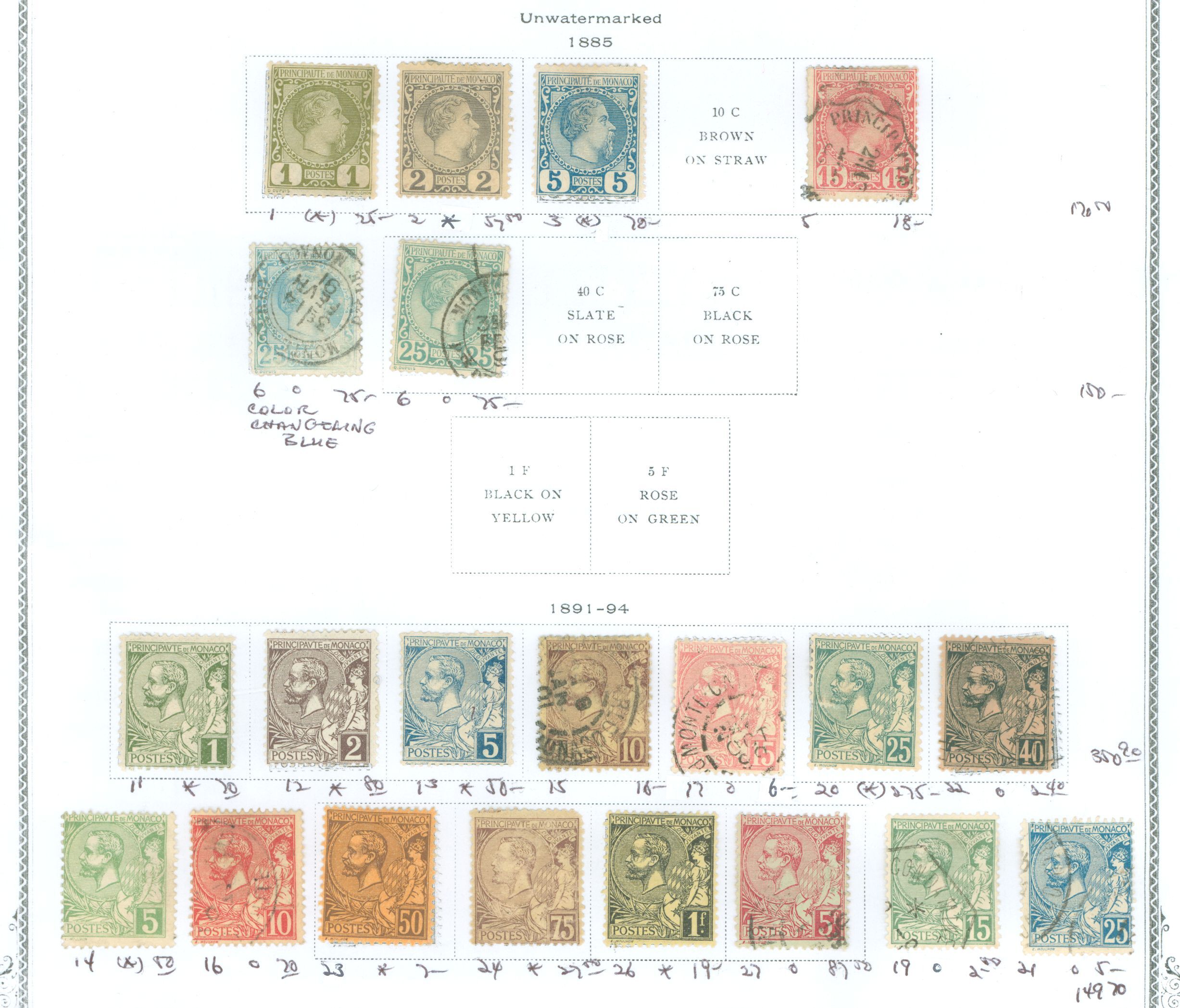 Early Monaco on old album page. High CV. Scott No,CV & condition *, (*), or O) shown for eachAPS Stamp Id: 502071060