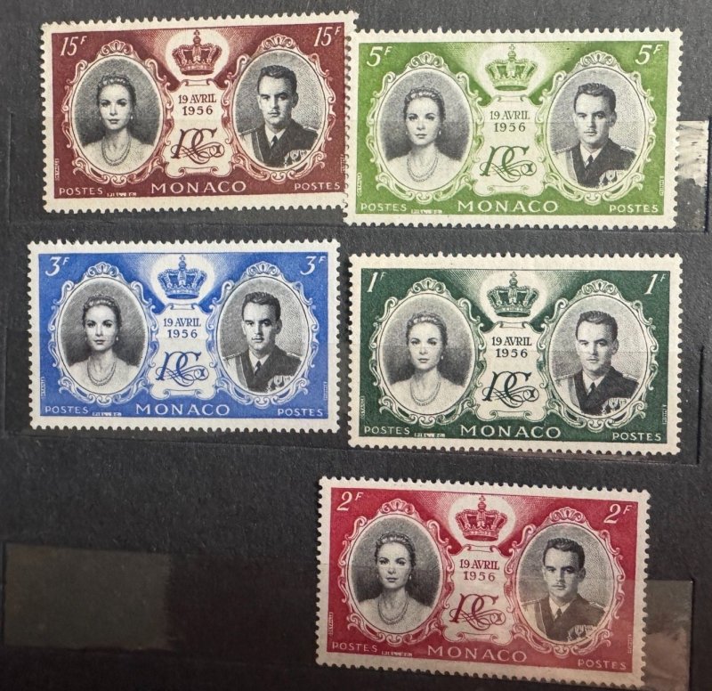 Issued 19 April 1956 to commemorate the wedding of Prince Rainier III and Grace Kelly (Princess Grace). Collection of 5ingle stamps - mint conditionUSA now charges additional Tariffs on all packages or envelopes - Canada Post charges $14.10 CDN for shipping Standard envelopes with tracking and USA Tariff is about $3.57 Canadian
