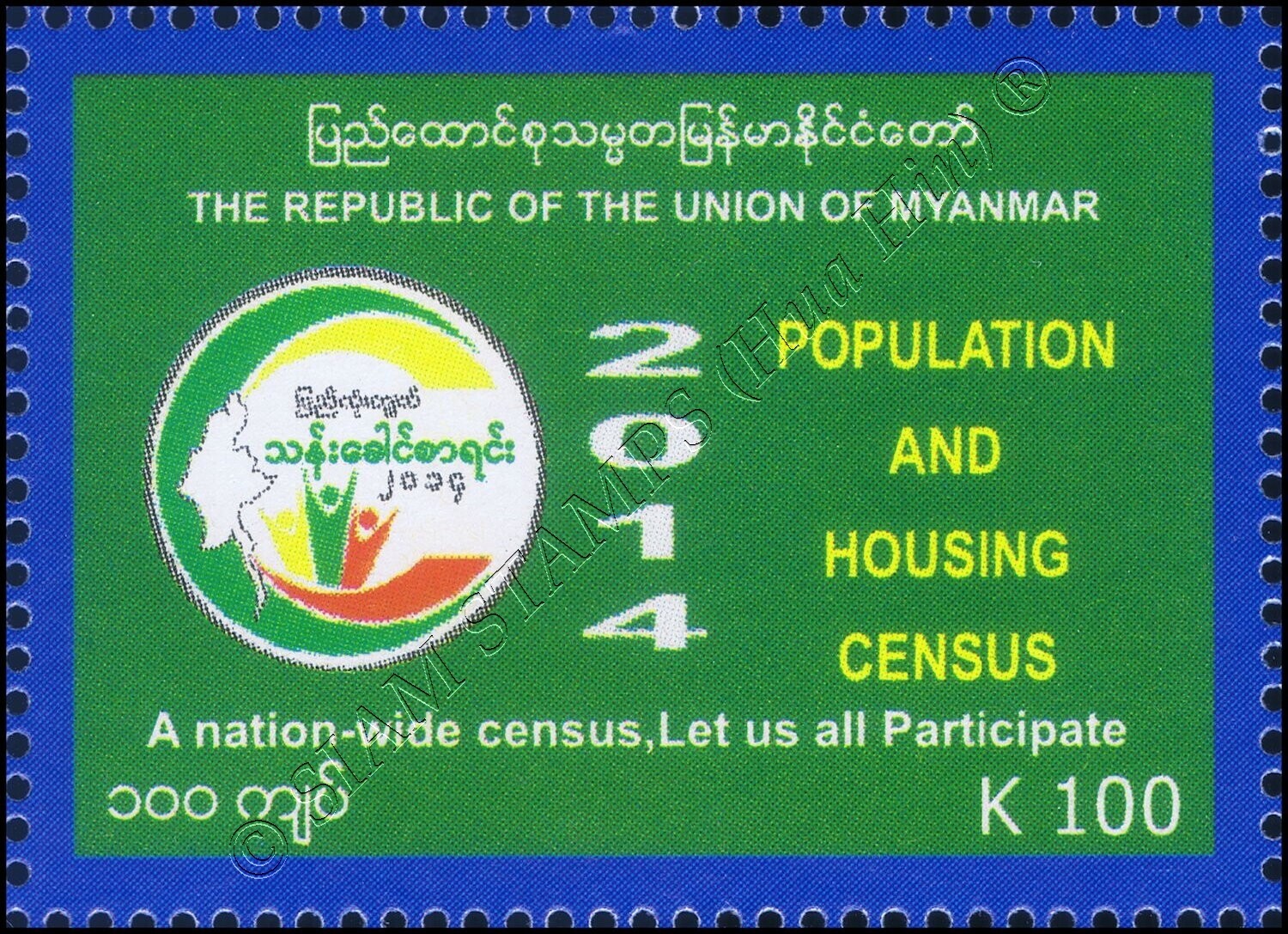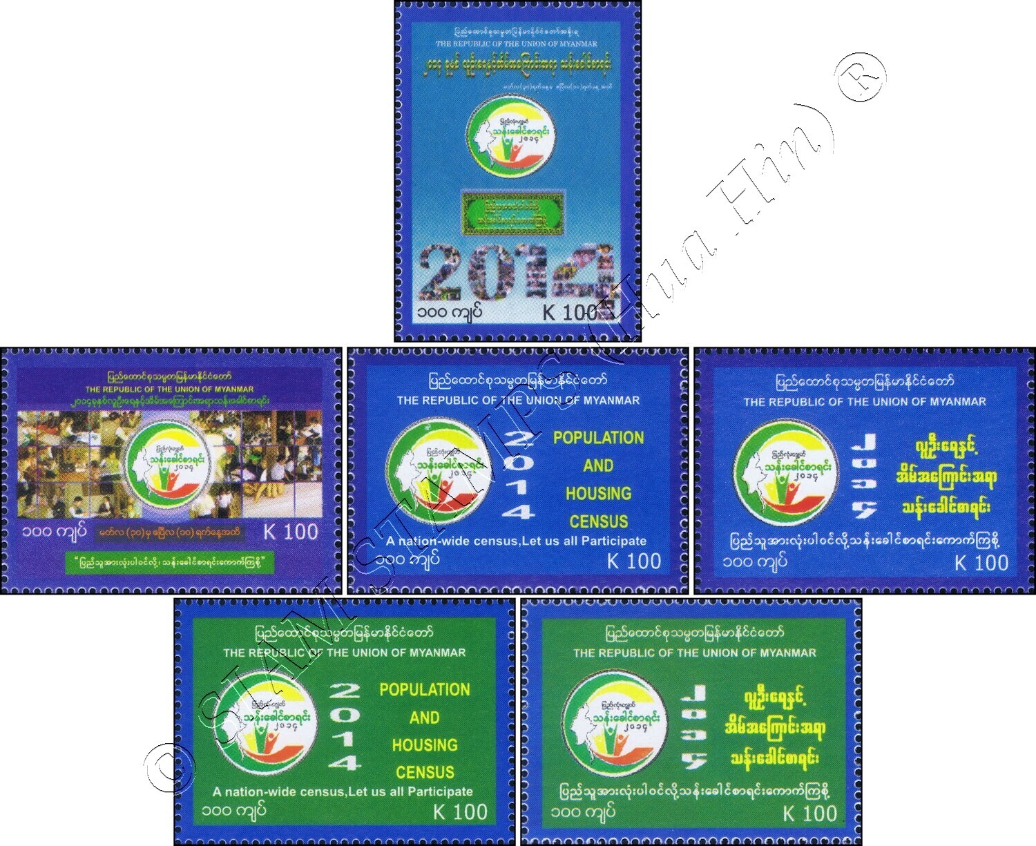 Grade: XF (Extremely Fine) Myanmar Census 2014 (II) (MNH) ARTICLE DESCRIPTION: MiNo. 426 - 431 MyanmarOdr. (10 x 5); perf. K 14 1/4:14Set, Issue date: 10/03/2014Picture descriptions:kh) logo and the year 2014ki) Lo ... Read More