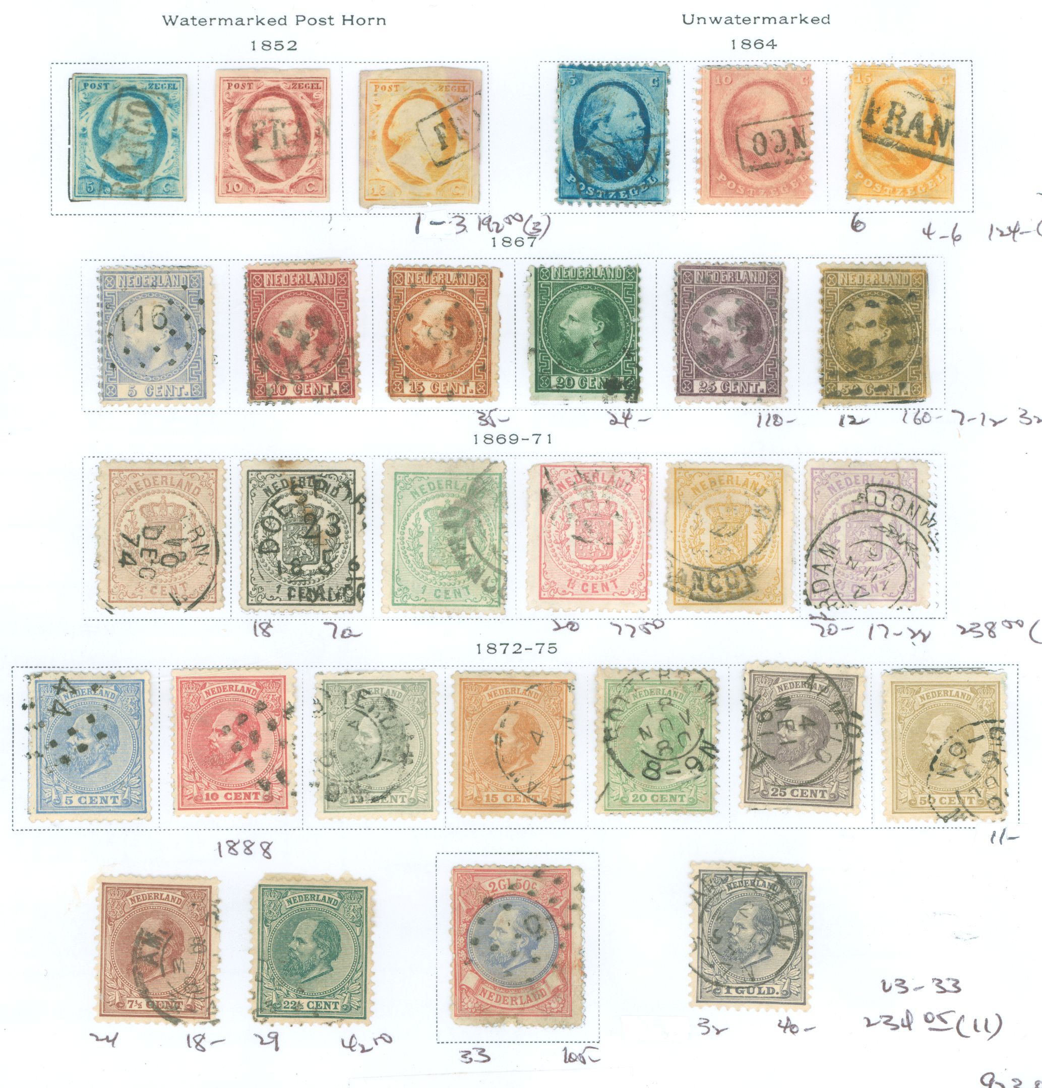 Early Netherlands complete on old album page. 6 & 12 are trimmed. 33 has pulled perfs at bottom with repairAPS Stamp Id: 502071058