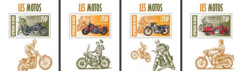 Grade: Ungraded Niger - Motorcycles - 4 Stamp Set - 14A-211 This is a beautiful 4 stamp set, issued by Niger in 2013, and featuring several styles of motorcycles and many famous people who rode them, including Jame ... Read More