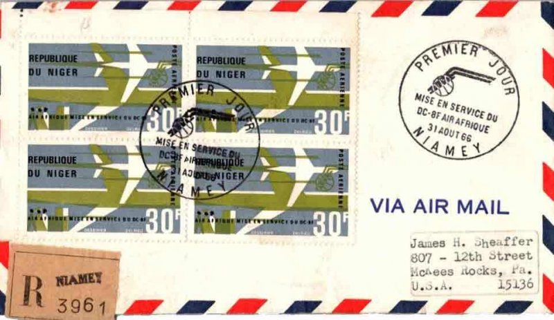 30F Air Afrique Block 1966 Premier Jour Mise En Service Du DC-8F Air Afrique, Niamey Registered Airmail to McKees Rocks, Pa. First Day. Uncacheted. Label address.