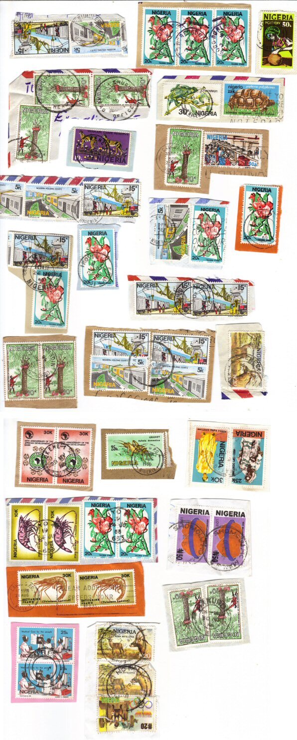 A mix of stamps from Nigeria, ON paper. All picked for their clear and reasonably complete town/date postmarks; some a bit faint. Good variety, roughly 1980s to 1990s.Seller Information