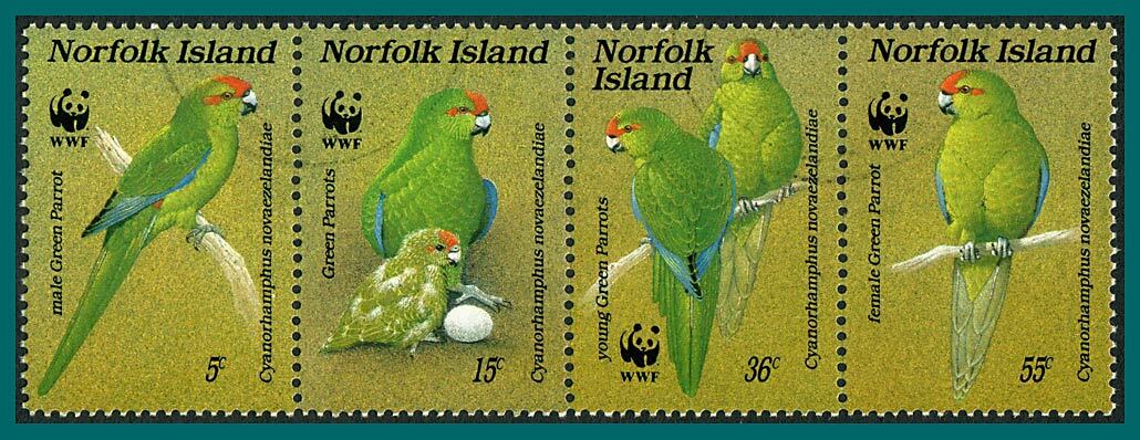 Full set of used stamps supporting World Wildlife Fund and featuring endangered species, green parrot. The stamps are shown in the scan.