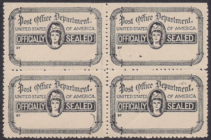 OFFICIAL SEAL; (Scott #OX29), block of four, SE at top, Full original Mint NH gum, gum wrinkles, LR seal has lt bend and a smudge (from printing?), not common, VF...