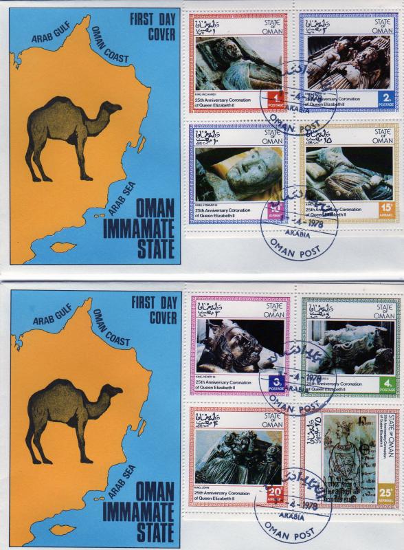 Oman Immamate State - 1.04.1978 - 25th.Anniversary of the Coronation of Queen Elizabeth II - Monuments of Kings of England - Set of 8 values perforated in 2 Officials FDCSeller Information