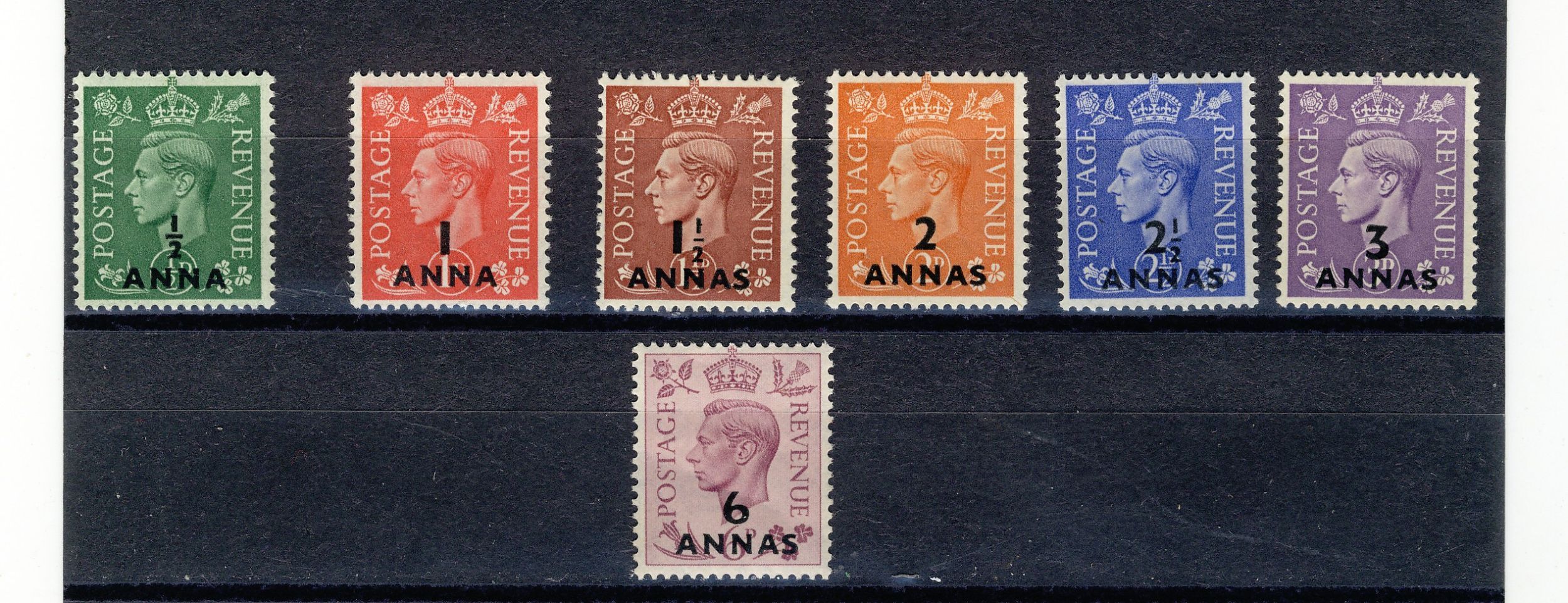 Oman & muscat 1948 "george vi" #16 - 22 mh c.V. = $36.00If you have any doubts, please call us:(1-905-685-1350) or require more scans, before buying / bidding.!