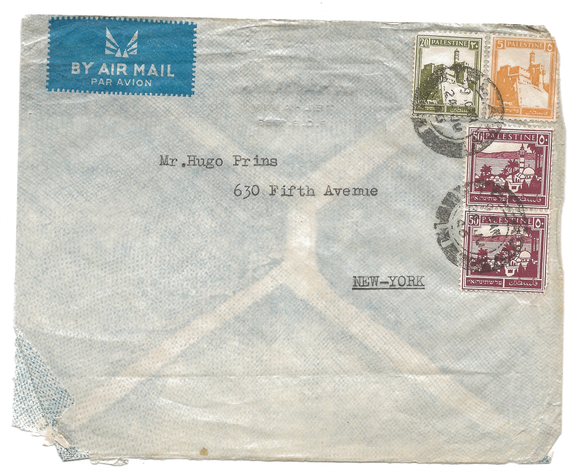 A nice cover to Hugo Prins, a jeweler and strong backer of the Jewish Independence and formation of Israel. Bale 93, 99, and two copies of #100 (all woven white paper). Scott numbers 67, 77, and 78. This covered the air mail rate to the USA. A nice piece of postal history associated with the formation of Israel, although roughly opened, with the 5m stamp having a folded cornerSeller Information