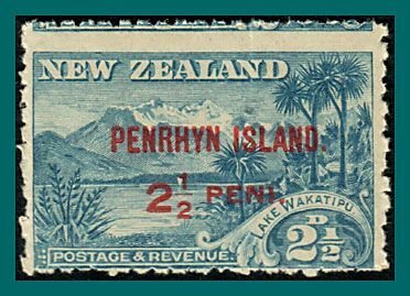 (SG 1; Sc 8) Single stamp of New Zealand showing Mt Wakatipu and overprinted for use on Penrhyn Island.The stamp is shown in the scans.