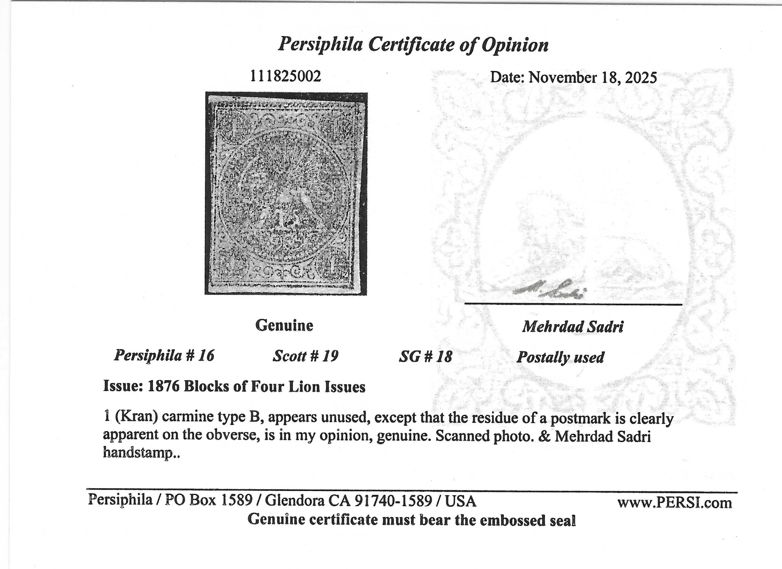 Persia, Stamp, Scott#19, Used, Hinged, 1K, carmine, type B, Certified, Lion,