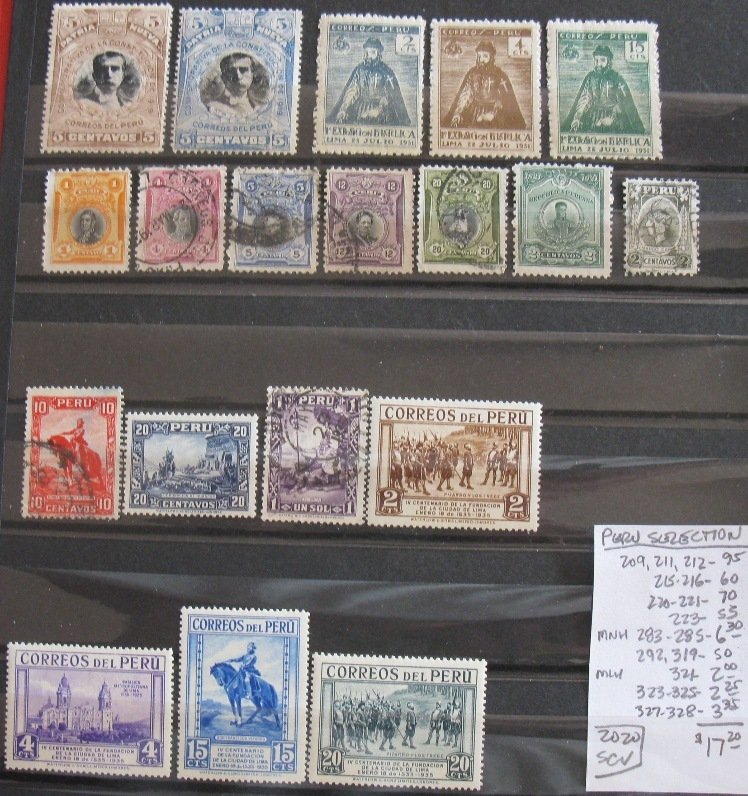 Selection of stamps from Peru Scott #'s 209//328. Total 2020 SCV=$17.20