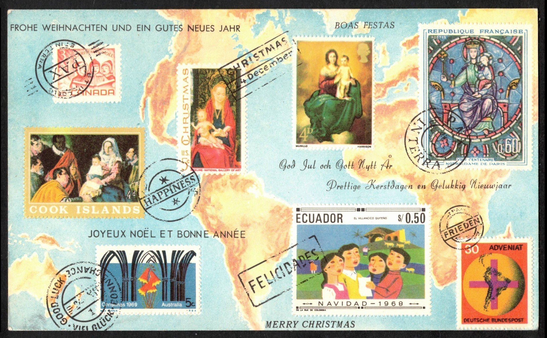 Philatelic christmas card with postage stamps replicas, used, printed in germany (p013)