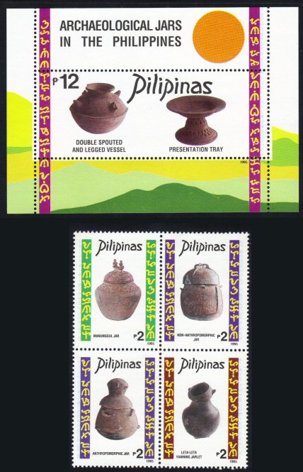 Philippines #2363-64 mint never hinged, block and mini sheet. Archaeology - artifacts, jars. 2011 catalog value $5.00.