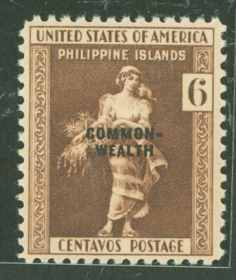 1939 6c La Filipina, dk brown(#385 w "Commonwealth" OP, small); rich, deep color, healthy margins; pristine PO fresh(OGNH glossy); hard to find as single APS Stamp Id: 501772041 APS Seller Id: 738268 Hinge Type: ... Read More