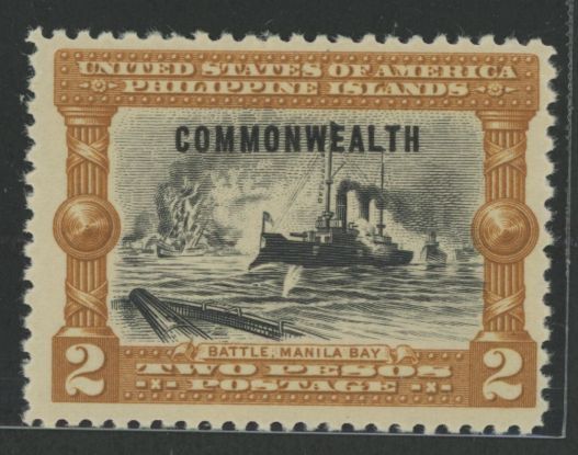 1939 2p Battle of Manila Bay, Bister Brn & blk (#394 w "Commonwealth" OP, small); decent margins, sharp plate Imp., glossy gum(OGHR), tiny HR; hard to find as singleAPS Stamp Id: 501780129