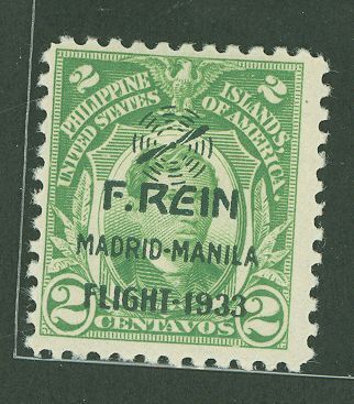 1933 2c F. Rein Flt, green (290 Rizal w OP); sound w (4) clear margins, glossy gum (OGHR); missing FM many collections APS Stamp Id: 501744936 APS Seller Id: 738268 Hinge Type: HR