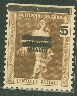 1942 5c on 6c J.O., Dk. Brn (#435 w OP); gorgeous La Filipina, sound; OGNH glossy, SCTD gum skips, F-VF, NSE-top; very hard to find as singleAPS Stamp Id: 501846977