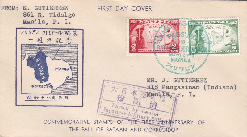 2c and 5c Fall of Bataan and Corregidor 1943 Maynila Local Use. First Day. Cacheted. Japan Military Censor. Typewritten Address.