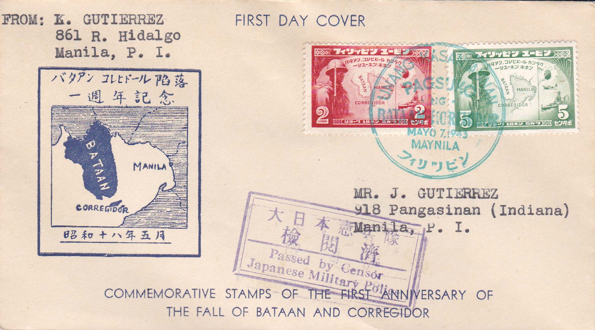 2c and 5c Fall of Bataan and Corregidor 1943 Maynila Local Use. First Day. Cacheted. Japan Military Censor. Typewritten Address.Seller Information