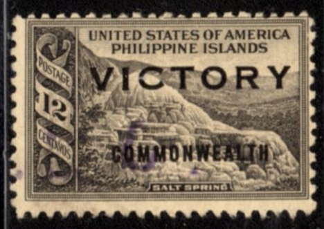 Philippines stamp #490 salt spring (#388 issue) overprinted "victory common-wealth".Postally used, possible hinge, possible pencil id, fantastic color, great stamp. See wysiwyg scan for perfs, centering, etc.