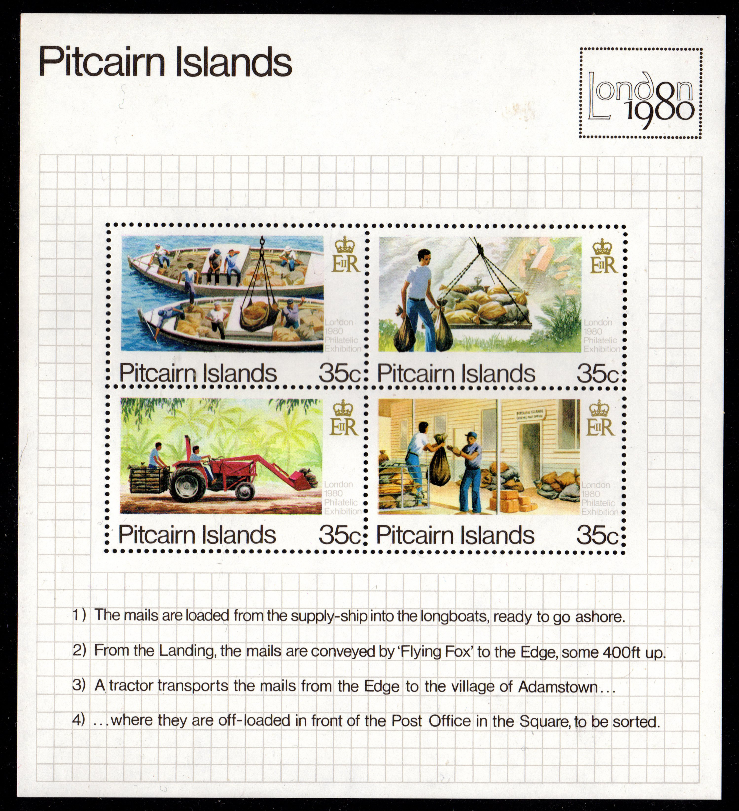 Mint never hinged souvenir sheet, Scott #192, issued in 1980 for the London 1980 International Philatelic Exhibition, with four stamps depicting various stages in postal operations on Pitcairn.