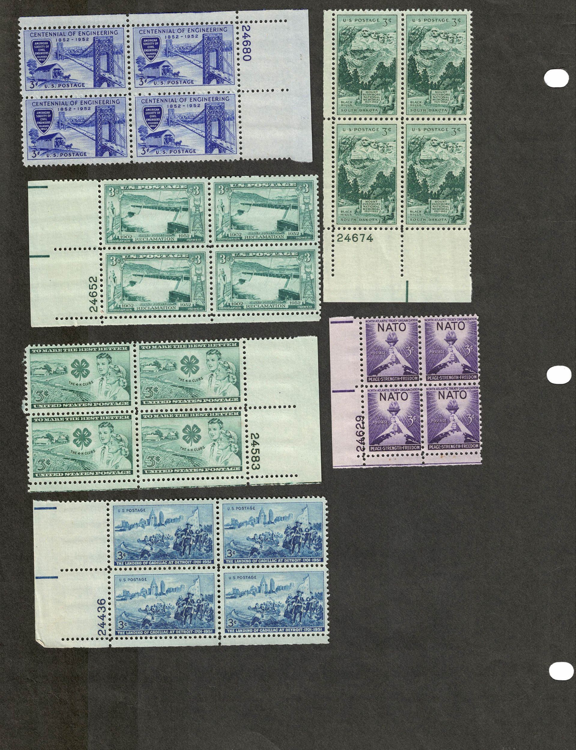 Plate Blocks, Scott # 1000, 1005, 1008, 1009, 1011, 1012, MNH, Cat = $ 6.00, Face = $ 0.72