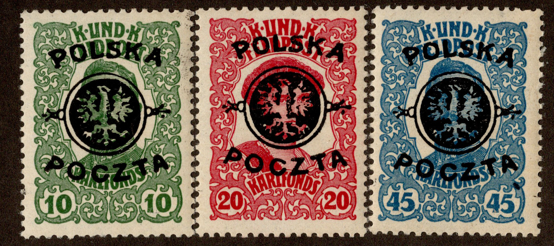 Lublin Issue Austria 10h to 45h KarI Military Overprinted Poczta Polska. Mint never hinged.