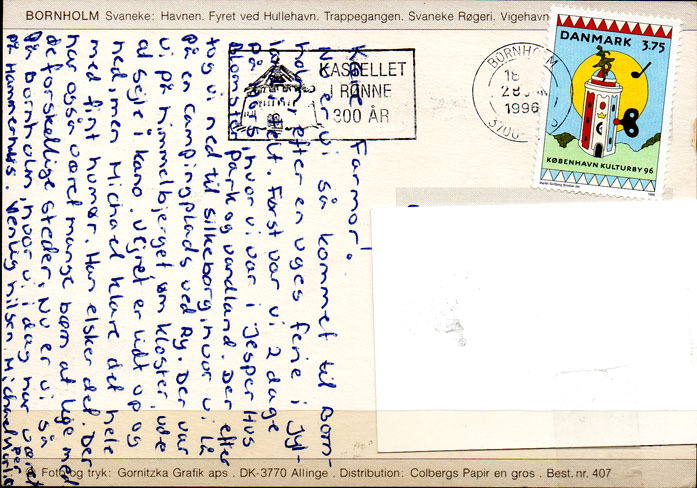 POSTCARD. DANMARK. Carlsberg Glyptotek. Musernes Sal. Unused. Copyr: Vilhelm Trydes Forlag Nr. 63 and BORNHOLM. Svaneke. The harbour. Postet to Aalborg. Cancelation: "Bornholm. 28.jun.1996. 3700". Copyr: Gornitzka Grafik aps. Nr: 407. (2). Kv.1. LP0454-7Seller Information