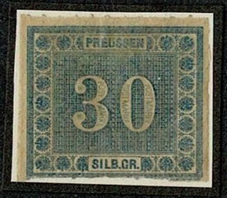 Prussia #22 mint hinged on a piece of card for safe mounting. This is a very thin, very fragile paper item, nicely handled. 2021 catalog value $110.00.