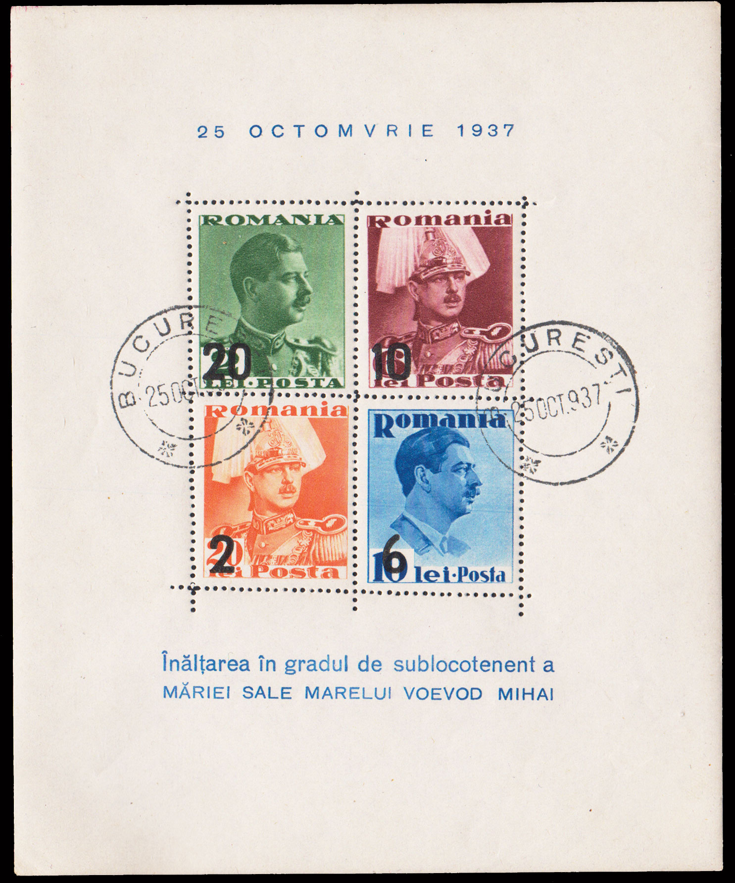 20L Overprinted 2L, 10L Overprinted 6L, 6L Overprinted 10L and 2L Overprinted 20L King Carol II Souvenir Sheet. Used.