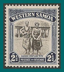 (SG 183; Sc 169) Single stamp from definitive issue showing Samoan Chief and wife, with NZ wmk 43 (Scott wmk 61) and perf 14 x 13.5. The stamp has slightly tropicalised gum and a hinge mark.The scan is an example of the stamp you will receive.