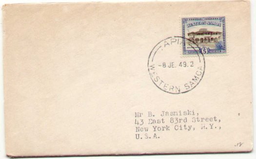 Addressed cover from Western Samoa, dated 8 JE 1949, looks like a First Day Cover, but I didn't check the date. Very fine, almost like new, with stiff cardboard inside.