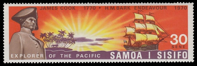 Samoa, Scott #332, 1970 Bicentenary of Capt. James Cook's Exploration of South Pacific - Capt. Cook, Island Scene and "Endeavor" issue in Mint Never Hinged condition.Scott 2026 Catalogue Value $3.00