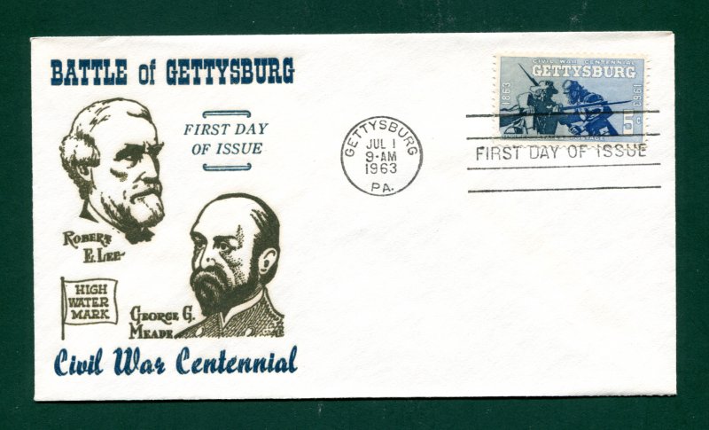 FDC produced for the 5c Battle of Gettysburg stamp issued as part of the "Civil War Centennial" series in Gettysburg, Pennsylvania, on July 1, 1963 (Sc. 1180). Dark blue & olive green cachet produced by Centennial Cachets, featuring portraits of Confederate General Robert E. Lee and Union General George G. Meade. Listed as No. M-34 in _Mellone's Specialized Cachet Catalog of First Day Cover of the 1960s_. Unaddressed. Key Words: Confederacy - Union - Civil War - Robert E. Lee - George Meade - Gettysburg.Seller Information