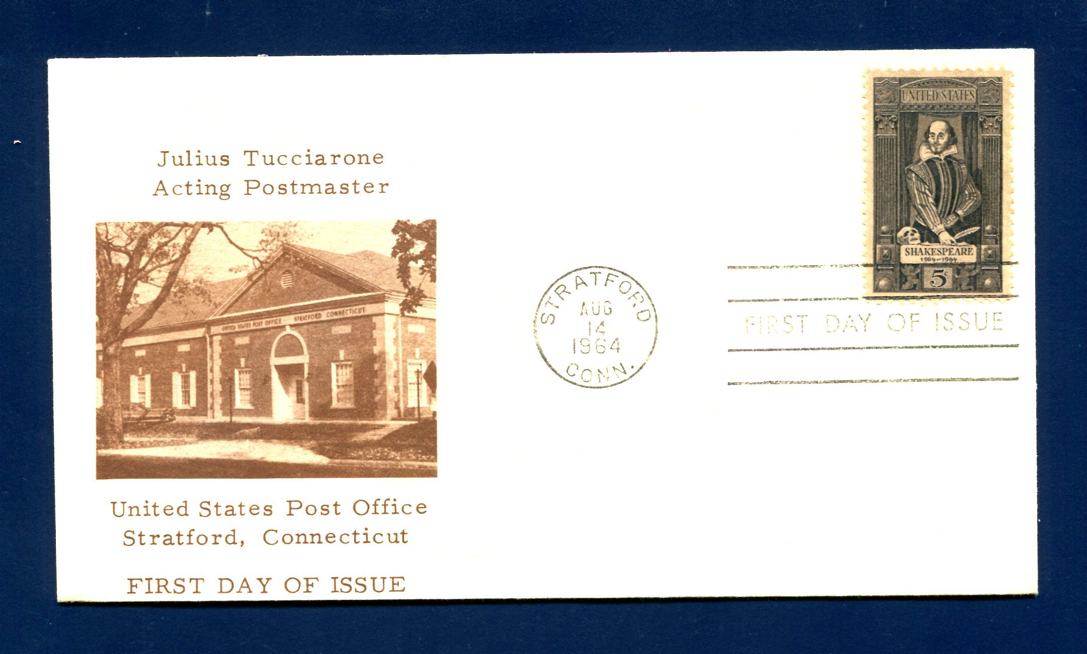 FDC produced for the 5c Shakespeare stamp issued in Stratford, Connecticut on August 14, 1965 (Sc. 1250). Brown cachet on a beige envelope produced by an Unknown Cachetmaker, featuring a photograph of the U.S. Post Office in Stratford, Connecticut, the town where the Shakespeare stamp was issued. Not listed in _Mellone's Specialized Cachet Catalog of First Day Covers of the 1960s_. Unaddressed. Key Words: Bard - poetry - English Literature - Shakespeare.Seller Information