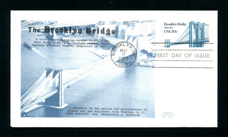 FDC produced for the 20c Brooklyn Bridge stamp issued on May 17, 1983 in Brooklyn, New York (Sc. 2041). Light blue & black cachet produced by EduCachet, featuring a photo of the bridge, plus some informative text. Unaddressed. Key Words: architect - architectural - engineering - engineers - New York City - bridge - Brooklyn.Seller Information