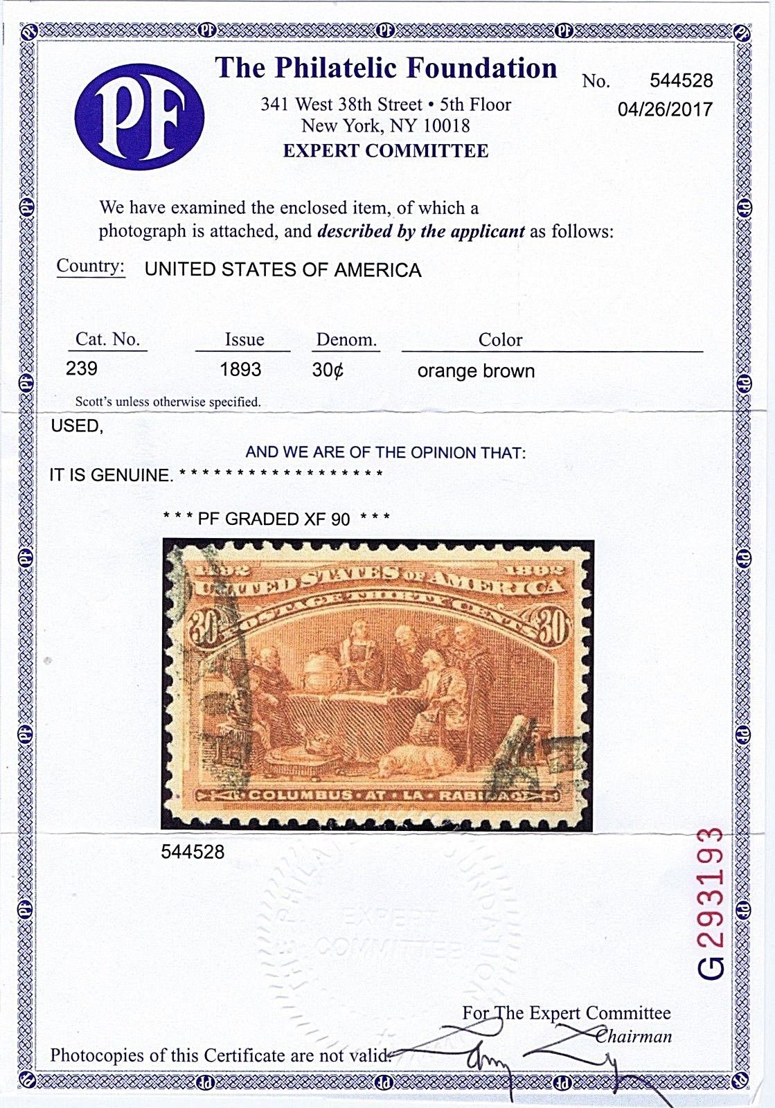 SC# 239 USED 30c COLUMBUS AT LA RABIDA 1893 PF CERT GRADED EXTRA FINE 90
