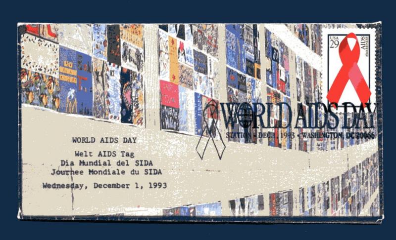 FDC produced for the 29c AIDS Awareness stamp issued in New York, New York, on December 1, 1993 (Sc. 2806). Multicolored cachet produced by an Unknown Cachetmaker, featuring a giant AIDS quilt. Unaddressed. Key Words: hospital - nurse - nursing - doctor - medicine - medical - AIDs.Seller Information