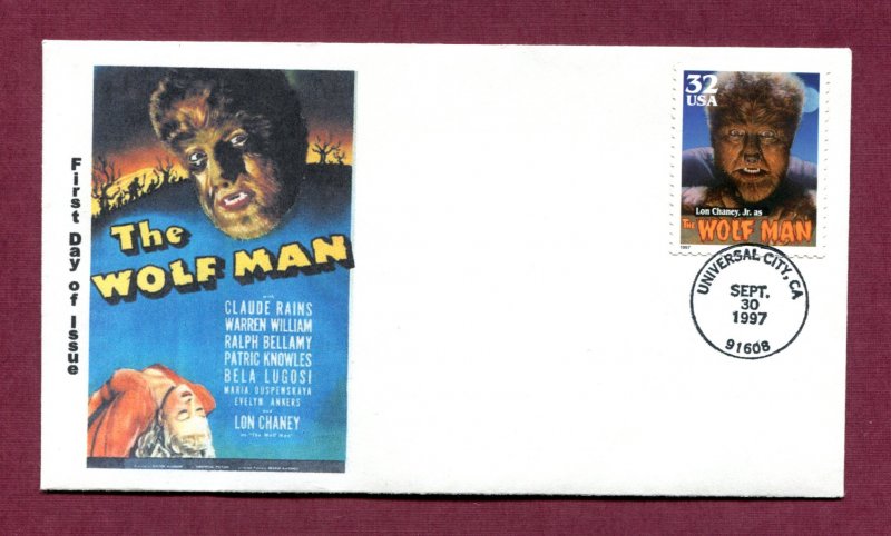 FDC produced for the 32c Wolf Man stamp issued as part of the Classic Movie Monsters set of 5 stamps issued on September 30, 1997, in Universal City, California (Sc. 3172). Multicolored cachet produced by an Unknown Cachetmaker, featuring the theatrical poster for _The Wolf Man_, released in 1941, starring Clause Rains and Ralph Bellamy. Unaddressed. Key words: Hollywood - cinema - movies - motion pictures - films - monsters - Wolfman - Wolf Man.Seller Information