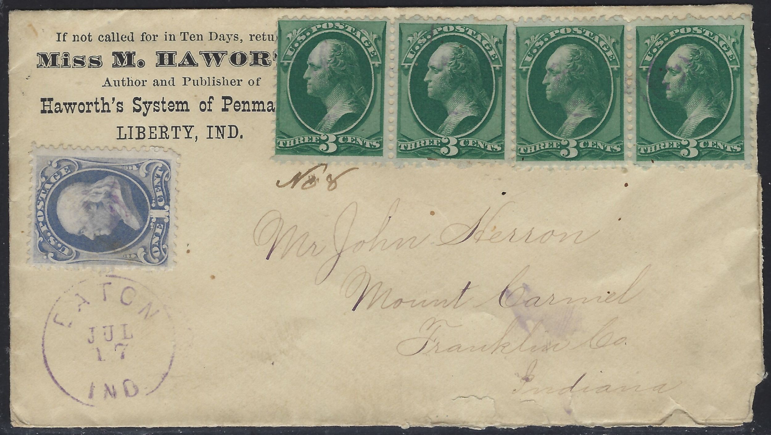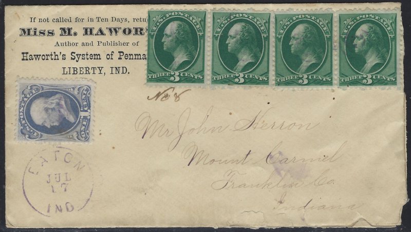 Scott # 156 & (4) # 158 Lot E 309 on Envelope Mailed to Franklin, Co. IN Used